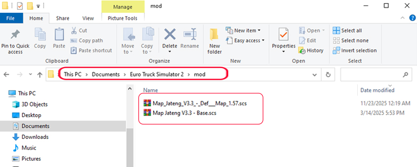 - Salin semua file berakhiran .scs ke dalam folder Documents\Euro Truck Simulator 2\mod.
